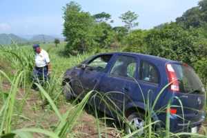 Tezonapa, Ver.- Daños por más de $15 mil fue lo que dejó al salirse un automóvil Meriva, de la Nissan, de modelo reciente, quien por el exceso de velocidad y la falta de precaución para conducir, fue a dar entre una parcela de caña.