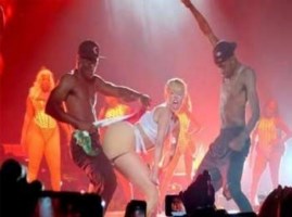 La polémica continuó con el famoso baile twerking, en el que portó de nueva cuenta unos glúteos de fantasía para hacer burla a la pose que la cantante Nicki Minaj adoptó para promocionar su sencillo “Anaconda”