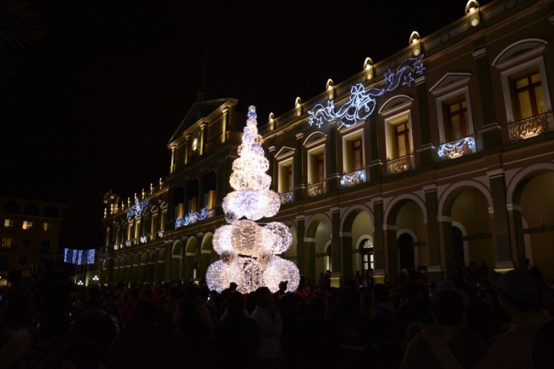 El Pino de Navidad que adorna la explanada municipal, tiene una altura de ocho metros, sobre una mesa de cuatro metros de diámetro, adornado en la parte baja por más de 300 macetas de Noche Buena.